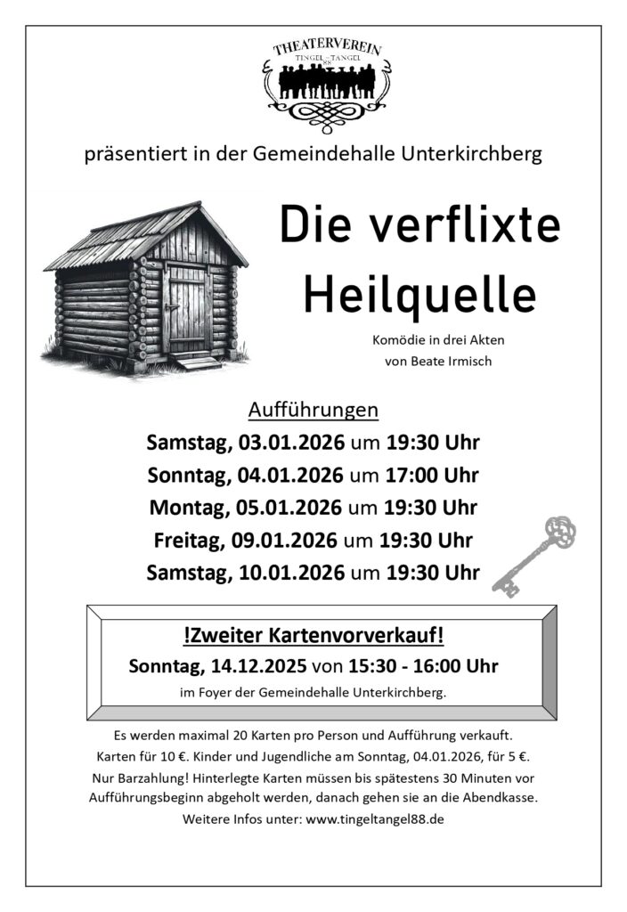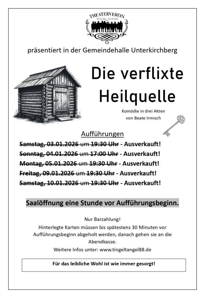 Wenn in Illerkirchberg Katja Ebstein singt, dann öffnet sich der Vorhang für das neue Stück des Theatervereins Tingel-Tangel 88. Nach vier langen Jahren des Wartens öffnete sich dieser Vorhang fünf Mal seit Anfang Januar für insgesamt knapp über 1.000 Theatergäste. Immer wieder von Situationskomik und Wortwitz unterbrochen, servierten die acht Schauspielerinnen und Schauspieler, unter ihnen zwei Neuzugänge, zwei Stunden lang eine heitere Kost und beste Unterhaltung. Von den Eintrittsgeldern fließen als Spende 4 x 500 Euro an den FC Illerkirchberg (Jugend), den Helferkreis Flüchtlinge, das DRK und die KJG Illerkirchberg.
